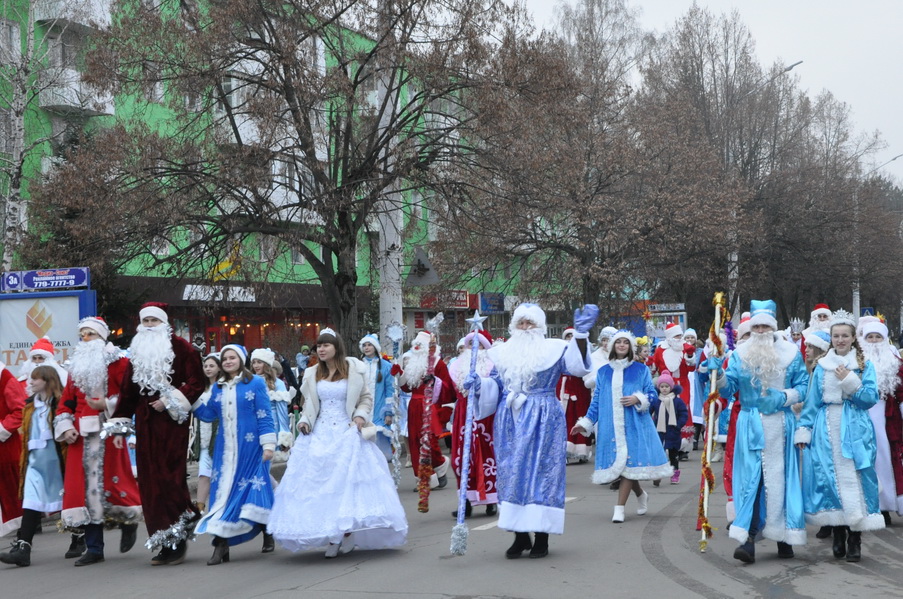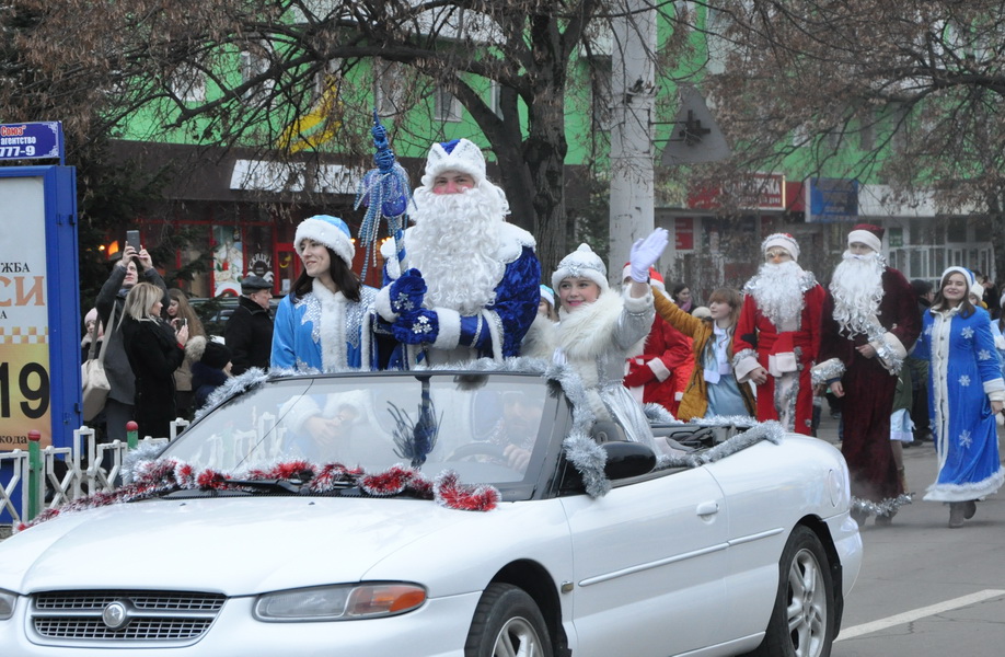 Десятки Дедов Морозов, Снегурочек и других сказочных персонажей прошли парадом по центральной улице города. Главный дед Мороз приехал на белом кабриолете.