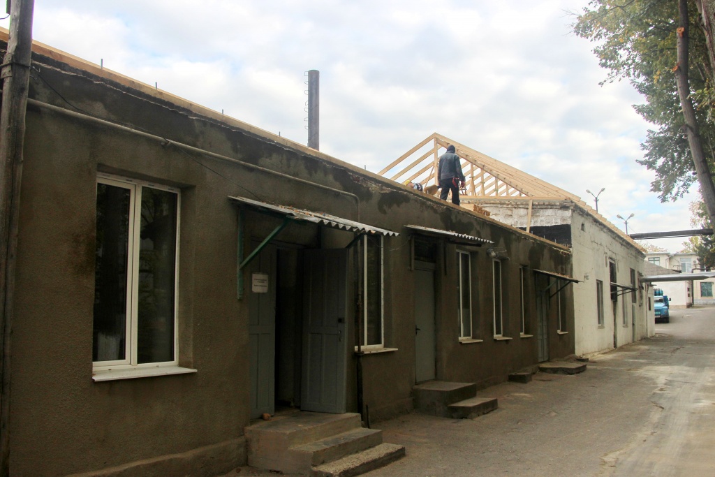 Также на территории больницы выполняют капитальный ремонт хозяйственного блока. Уже произведен демонтаж старой кровли. Ведутся работы по установке деревянного каркаса для дальнейшего обустройства.