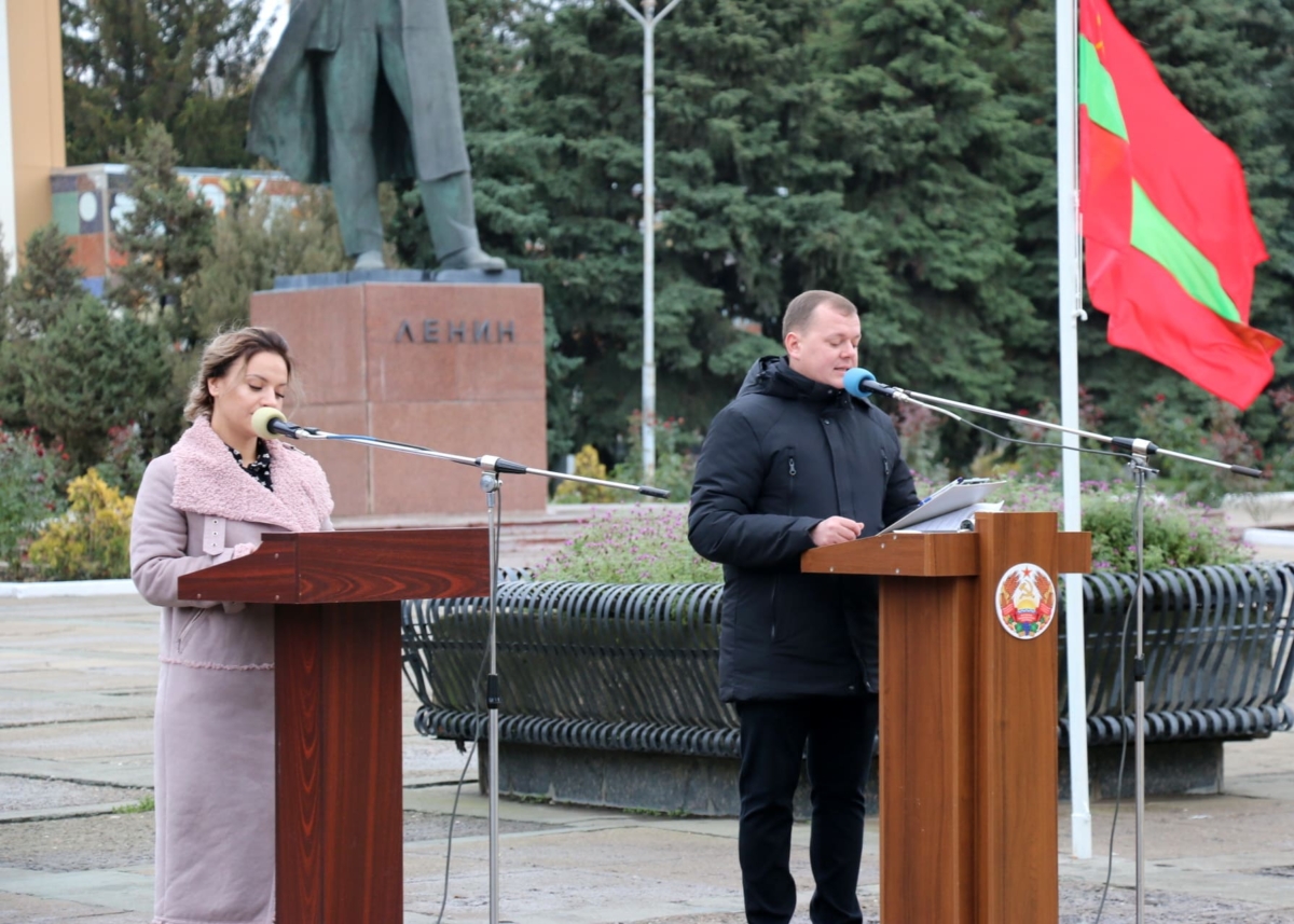 Право поднять флаги предоставили участнику боевых действий по защите Приднестровья Петру Муляр, члену президиума общественной организации «Женщины за права и свободы» Оксане Седых, президенту школьной Думы, ученику школы № 6 Богдану Сичко и президентскому стипендиату 2020 года, ученице теоретического лицея Елизавете Цыран.
