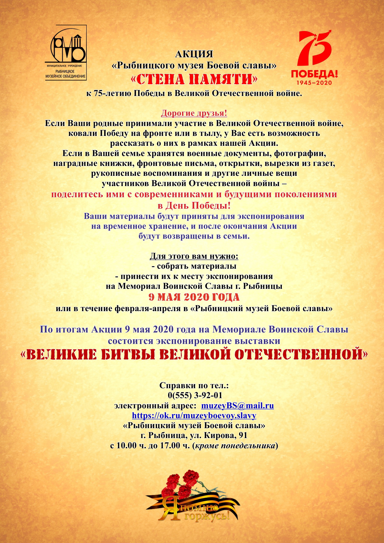 Рыбницкий музей Боевой Славы приглашает всех, кто хранит памятные вещи в семейных архивах и чтит память о своих дедах и отцах, участниках Великой Отечественной войны, ковавших Победу на фронте или в тылу, рассказать о героях в рамках этой акции. Рыбничане и жители сёл района могут поделиться имеющейся о них информацией. Желающие могут принести в музей Боевой Славы документы (фотографии, удостоверения, наградные листы, рукописи участников войны, фронтовые письма), личные вещи, предметы боевого быта. Их можно принести к месту экспонирования на Мемориал воинской Славы 9 Мая.