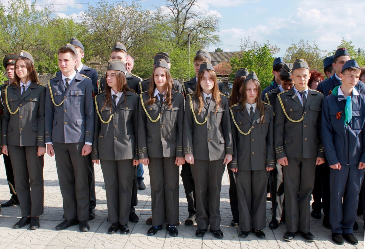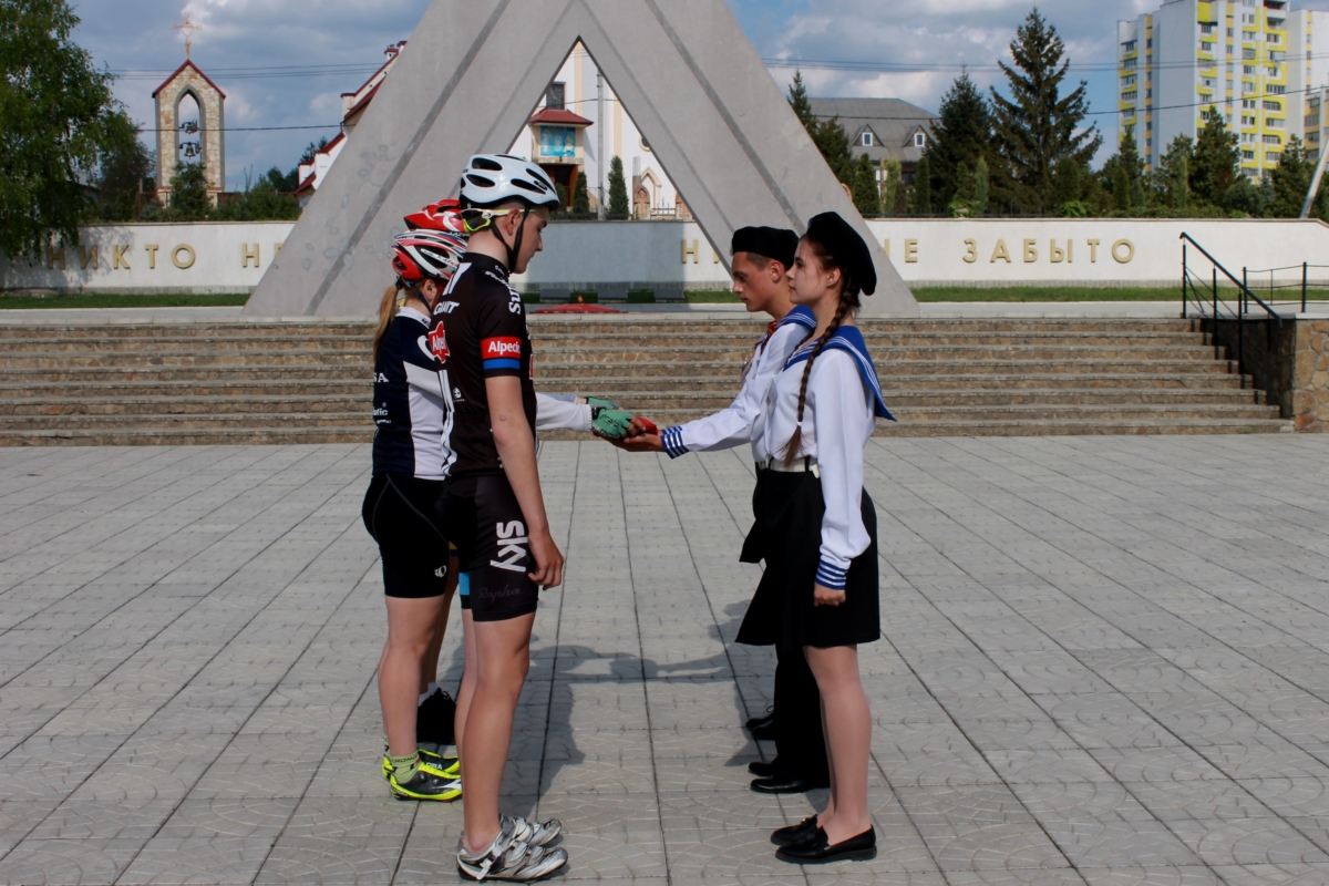 Участники велопробега в торжественной обстановке вручили победителям военно-спортивного фестиваля «Юный патриот Приднестровья» копию Знамени Победы. После чего все возложили цветы к Мемориалу Славы.