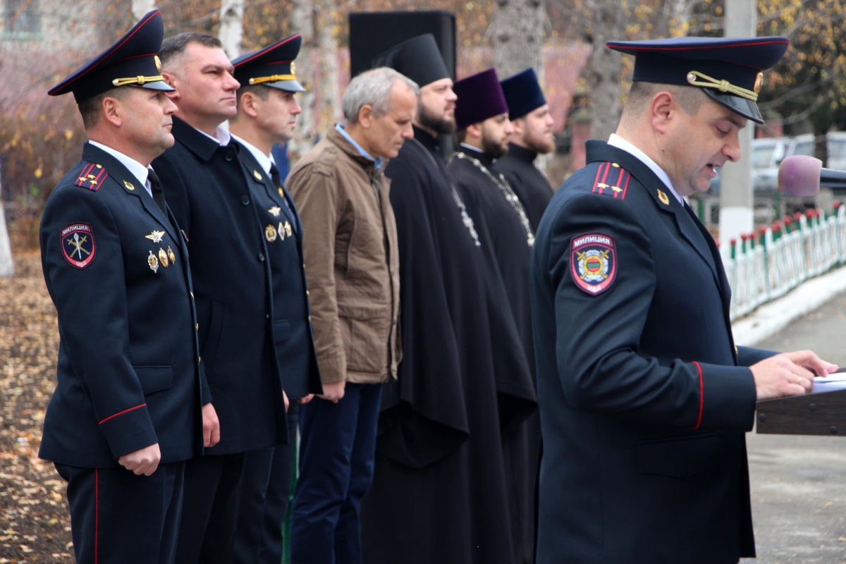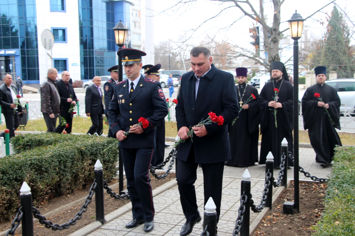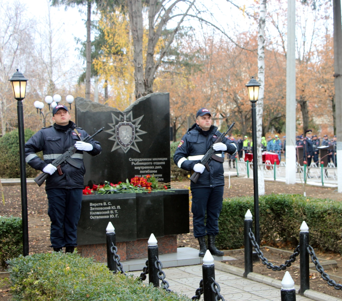 Торжественное мероприятие сегодня началось с возложения цветов к памятному знаку сотрудникам милиции, погибшим при исполнении служебного долга. Память о них почтили минутой молчания.