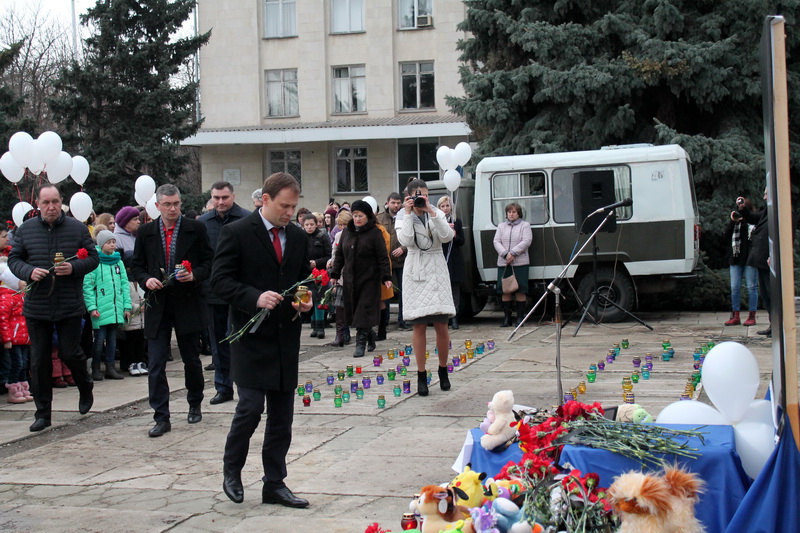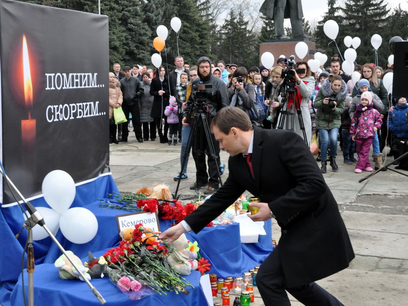 Первым цветы к временному мемориалу возложил глава госадминистрации Вячеслав Фролов. Акцию поддержали несколько сотен человек, возлагая цветы и мягкие игрушки. Рыбничане пришли на городскую площадь, чтобы выразить скорбь и сочувствие. Из горящих свечей люди выложили слова сопереживания: «Кемерово, скорбим».