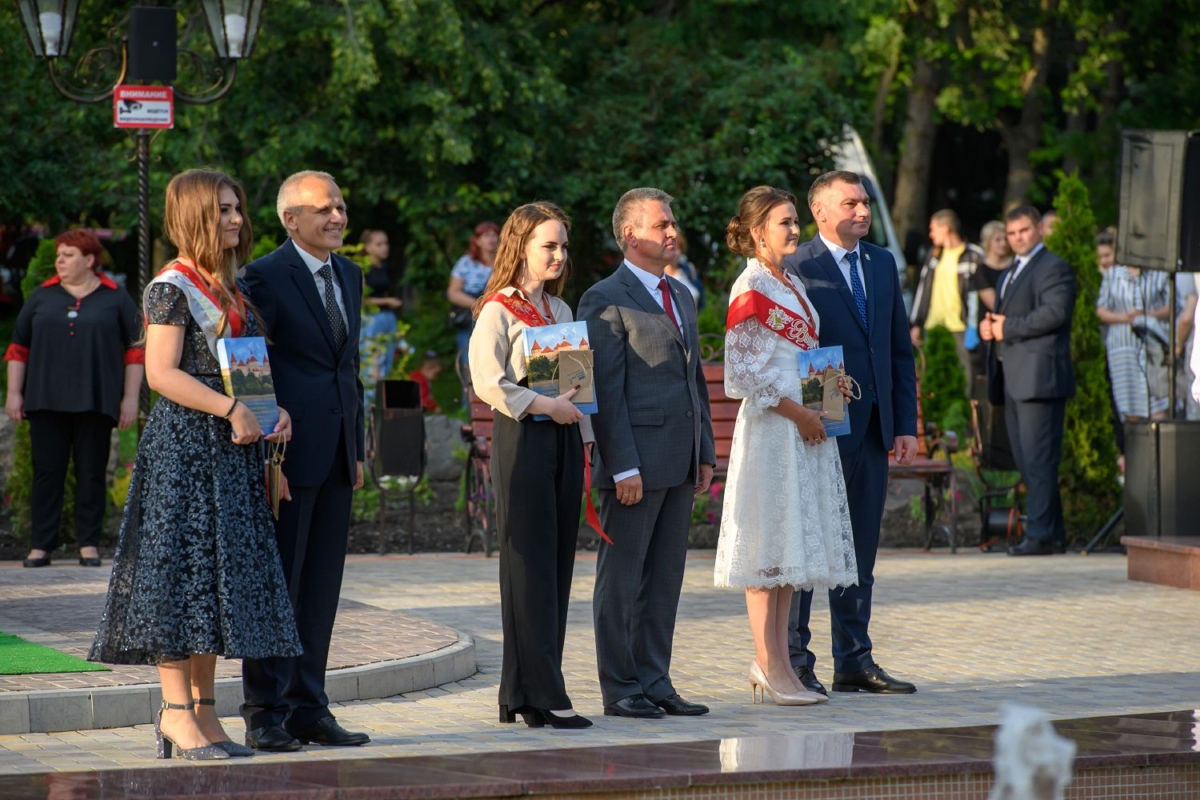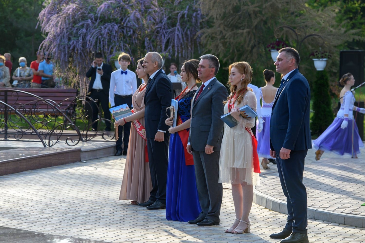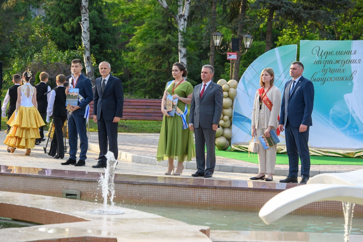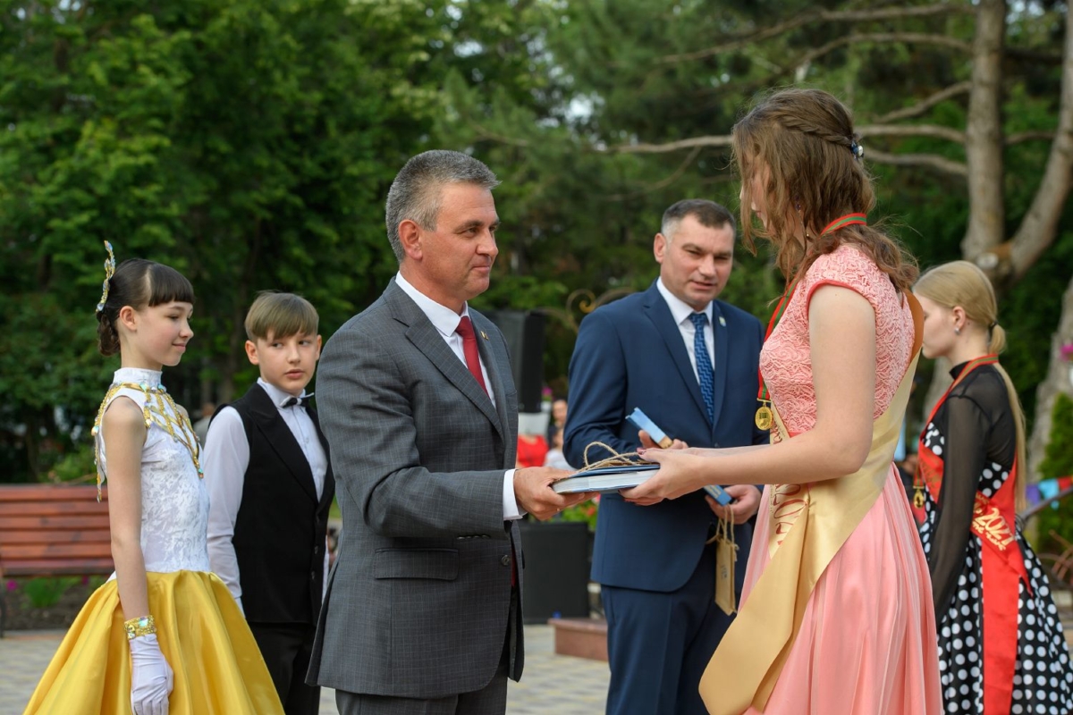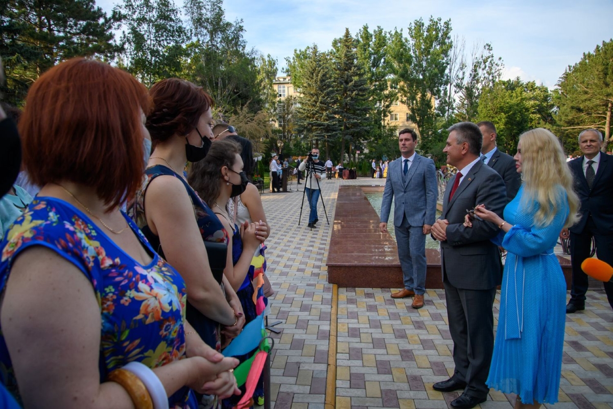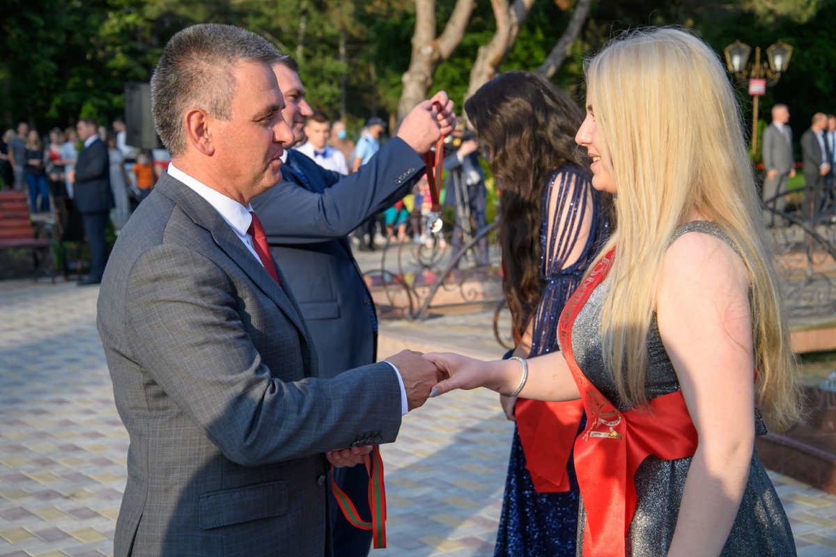 Вместе с супругой он участвует в торжественной церемонии чествования лучших выпускников школ Рыбницкого района. Праздничное мероприятие  организовано на площадке центрального городского парка.