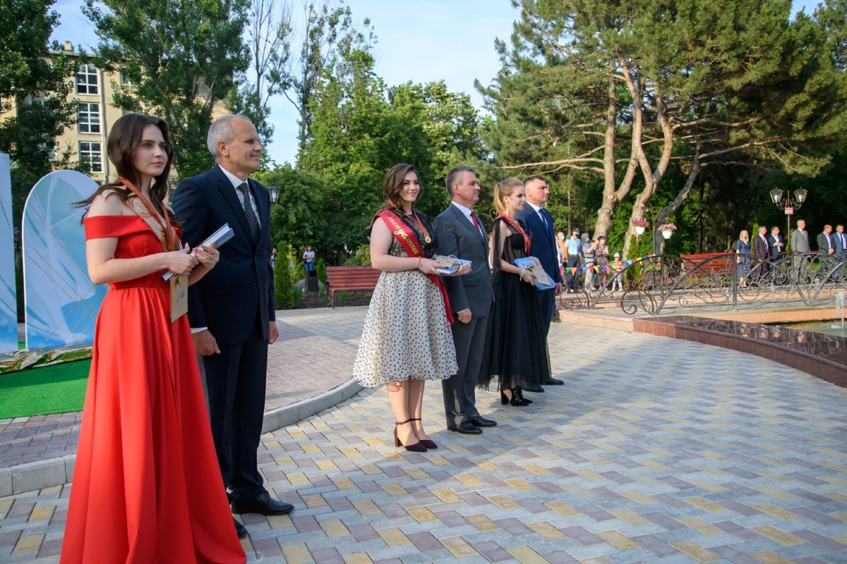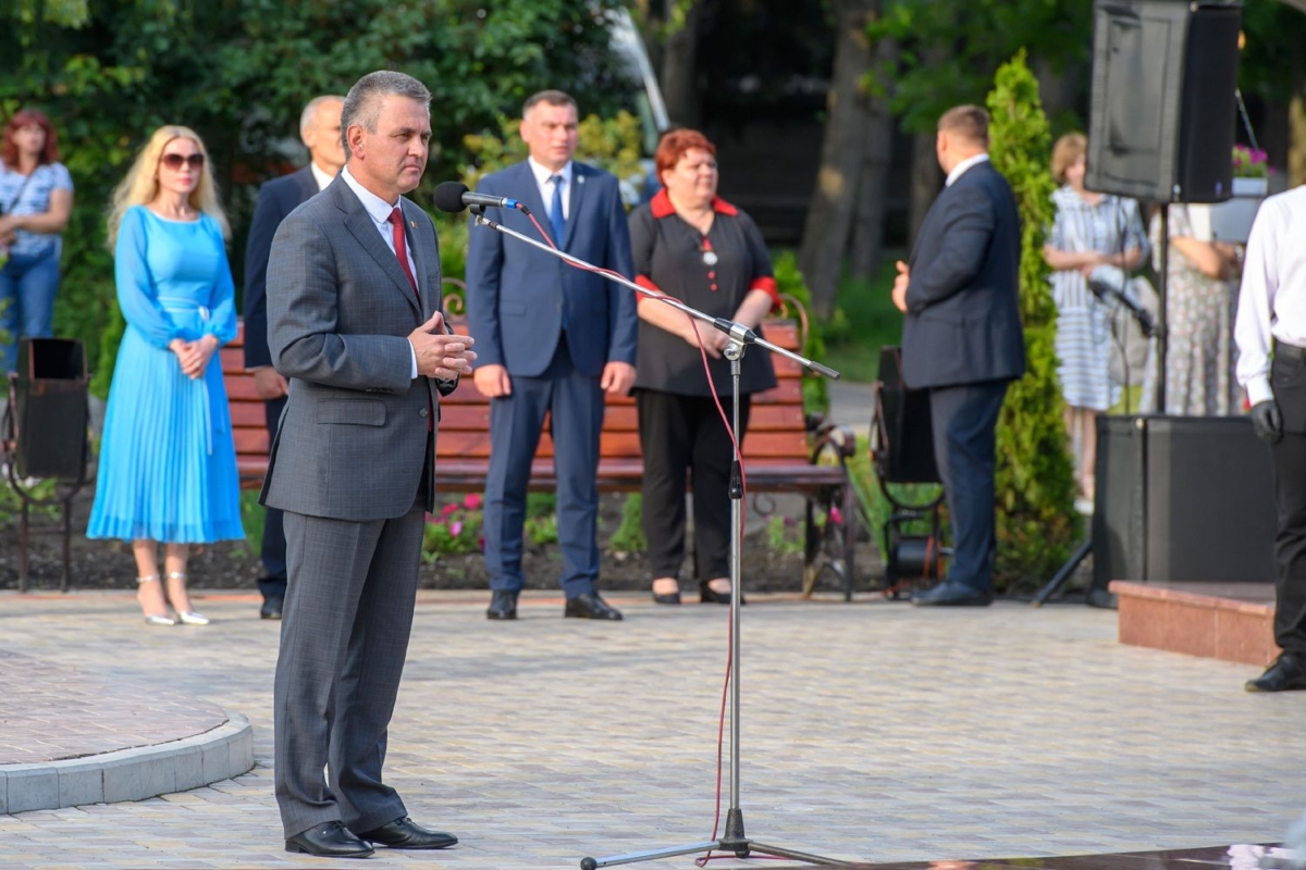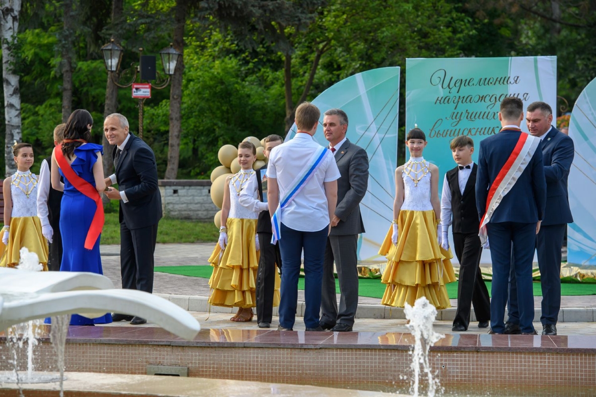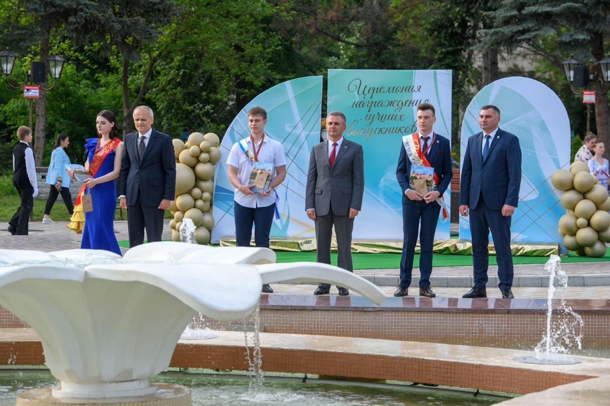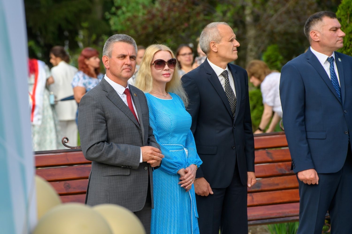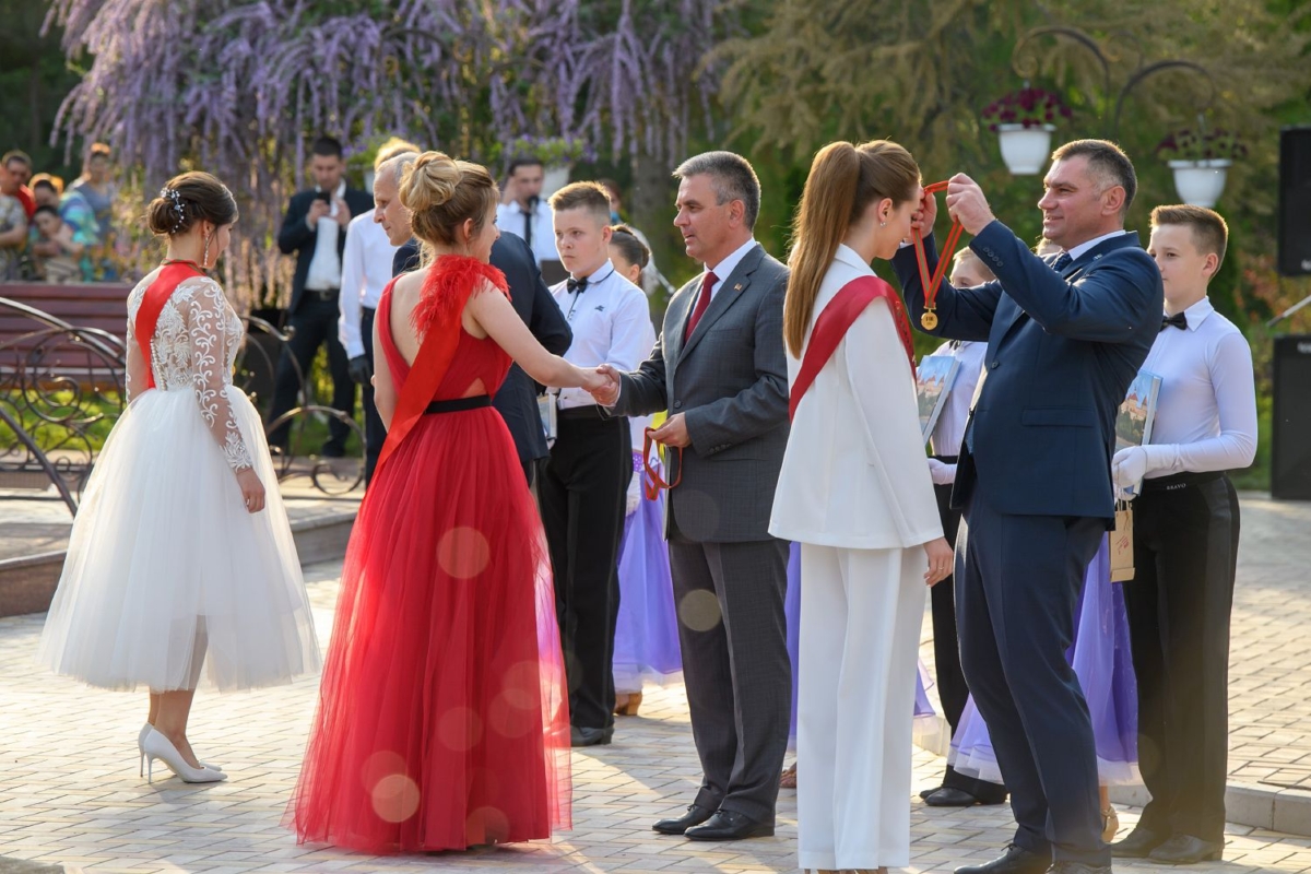 Вместе с супругой он участвует в торжественной церемонии чествования лучших выпускников школ Рыбницкого района. Праздничное мероприятие  организовано на площадке центрального городского парка.