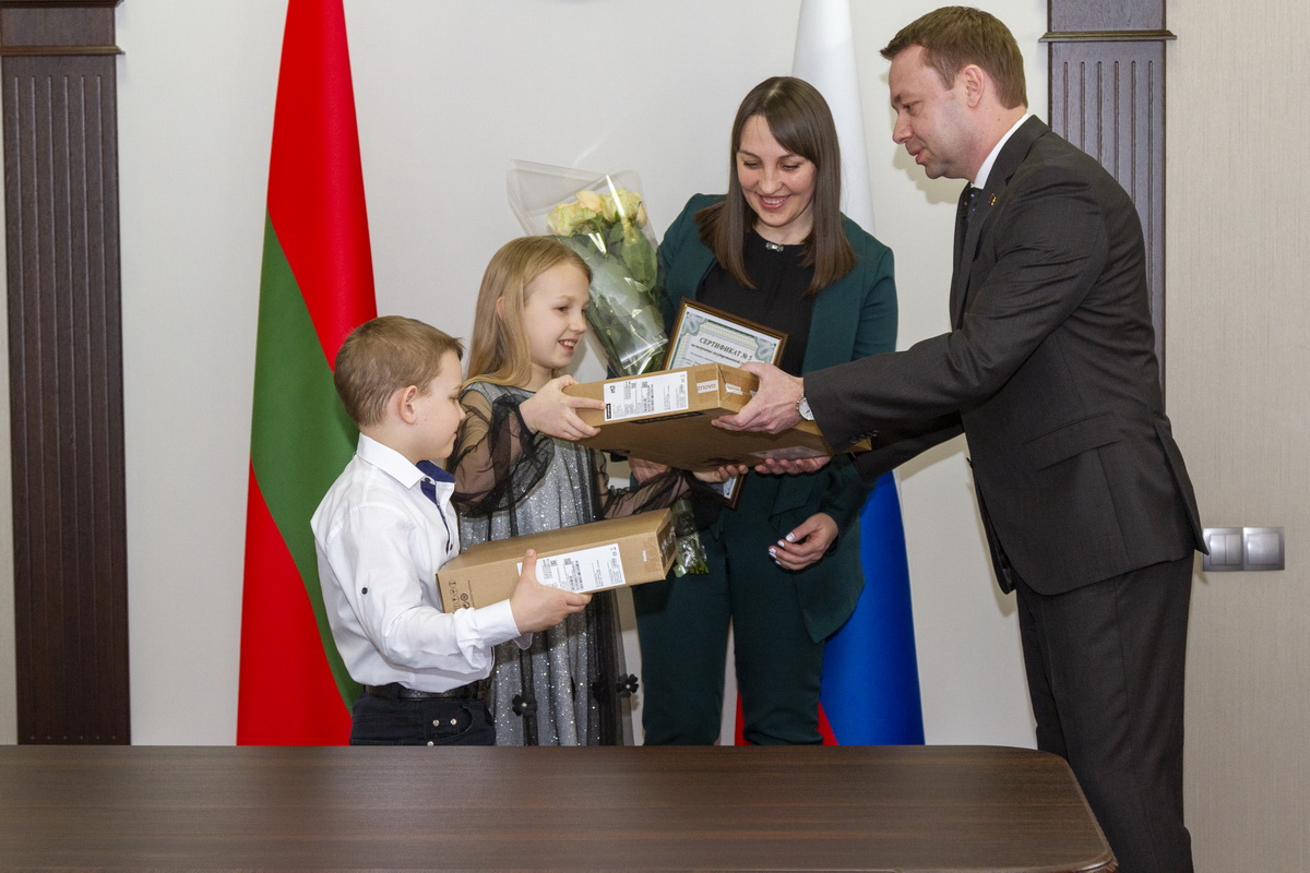 Татьяна Вердыш приехала не одна, а вместе с сыном Ваней и дочерью Аленой, которые тоже получили подарки – каждому по ноутбуку для учебы. Семья тоже из Рыбницы. Татьяна работает методистом в школе. О госпрограмме услышала от знакомых, которые уже приобрели жилье – сейчас делают ремонт, готовятся к заселению. Татьяна уверена – впереди только радостные хлопоты – выбор квартиры, ремонт и заселение на свои собственные квадратные метры.