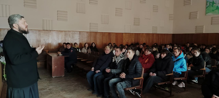 Перед ребятами выступил отец Виктор, настоятель Михайло-Архангельского собора. Он рассказал о смысле первородного греха, о том, что такое настоящая нравственность и почему важно уметь различать добро и зло в повседневной жизни.