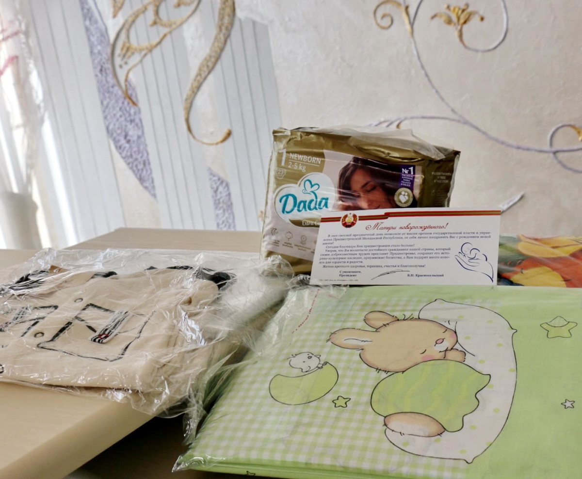 В этом году по инициативе Президента Приднестровья Вадима Красносельского родители всех новорожденных получают подарочные наборы. В комплект входят постельное белье, детское одеяло и полотенце, детский костюм и упаковка одноразовых подгузников.