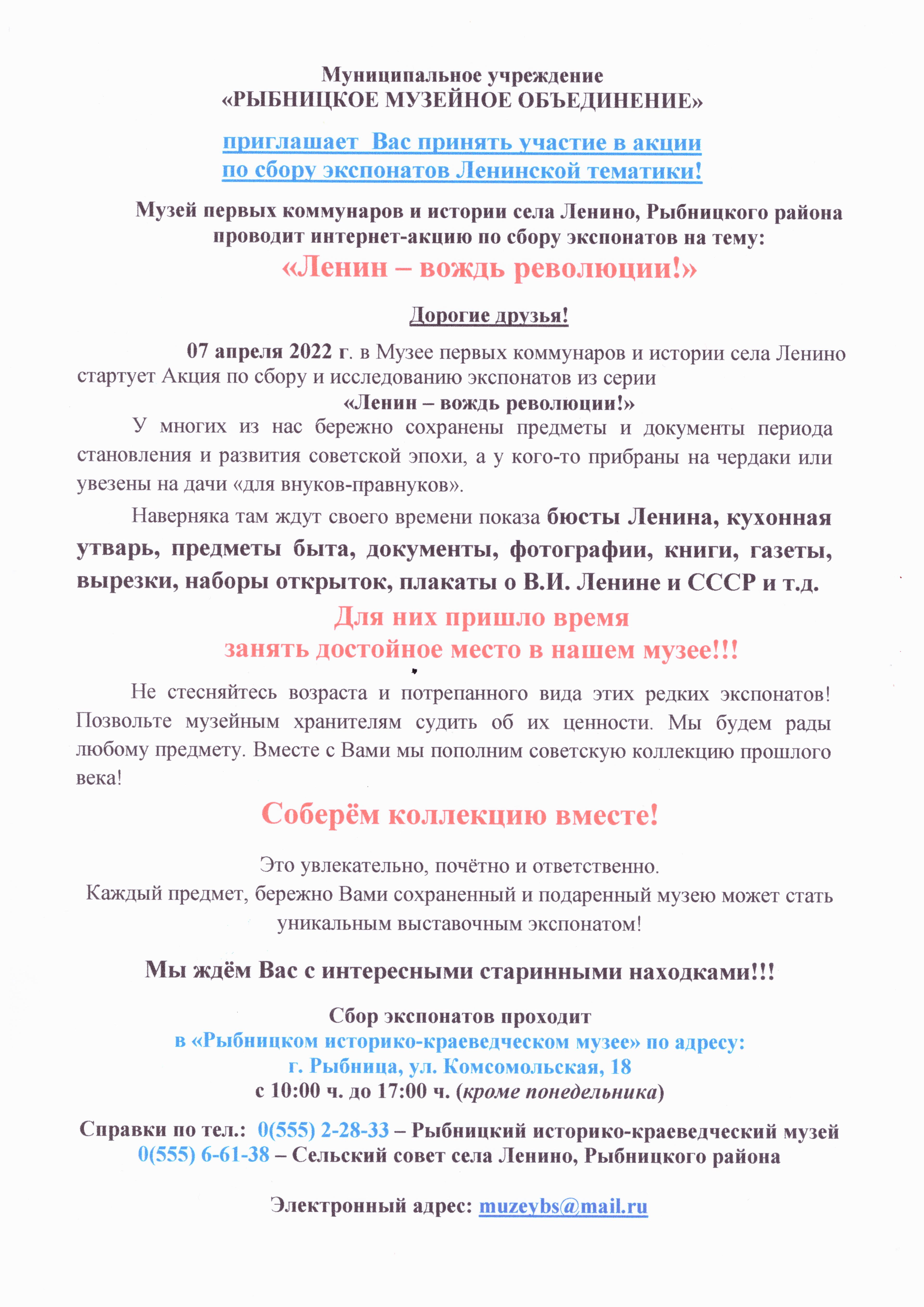 «У многих из нас бережно сохранены предметы и документы периода становления и развития советской эпохи. Наверняка там ждут своего времени показа бюсты Ленина, кухонная утварь, предметы быта, документы, фотографии, книги, газеты, вырезки, наборы открыток, плакаты о В.И. Ленине и СССР. Пришло время им занять достойное место в нашем музее», – говорят организаторы акции.