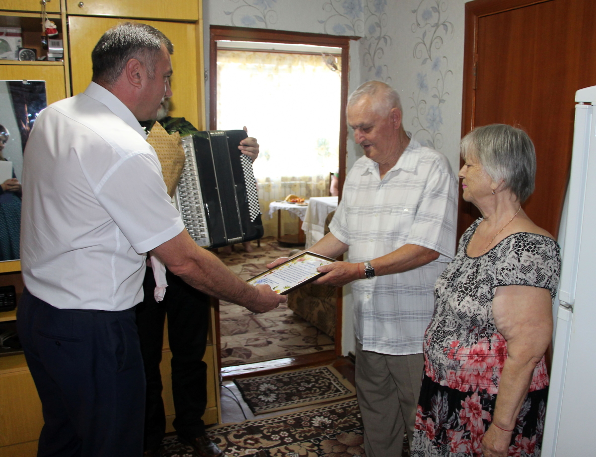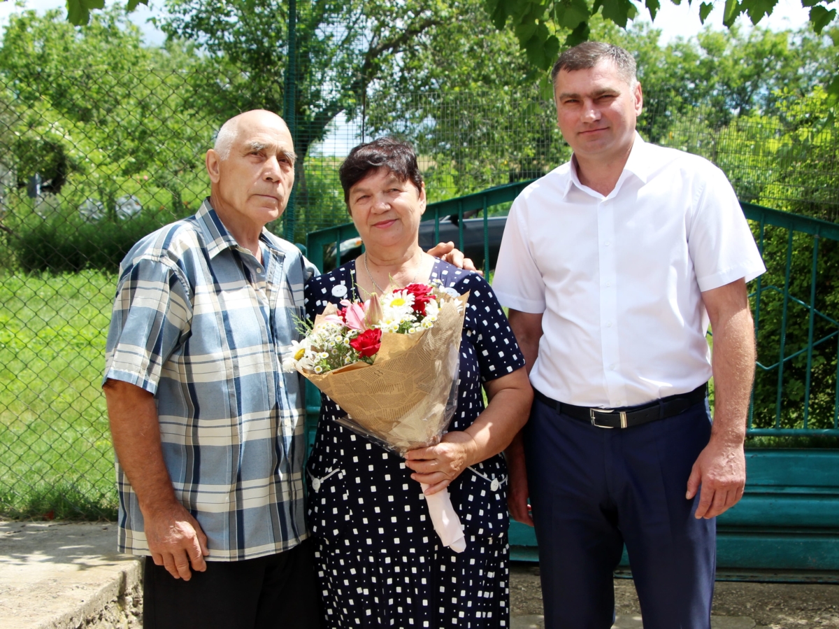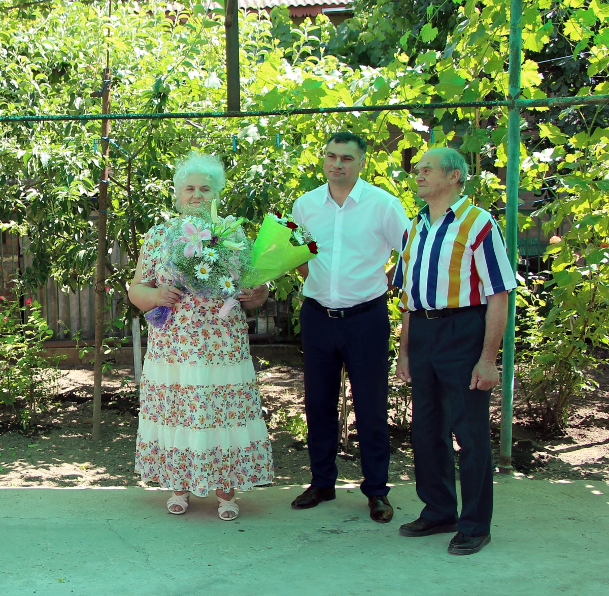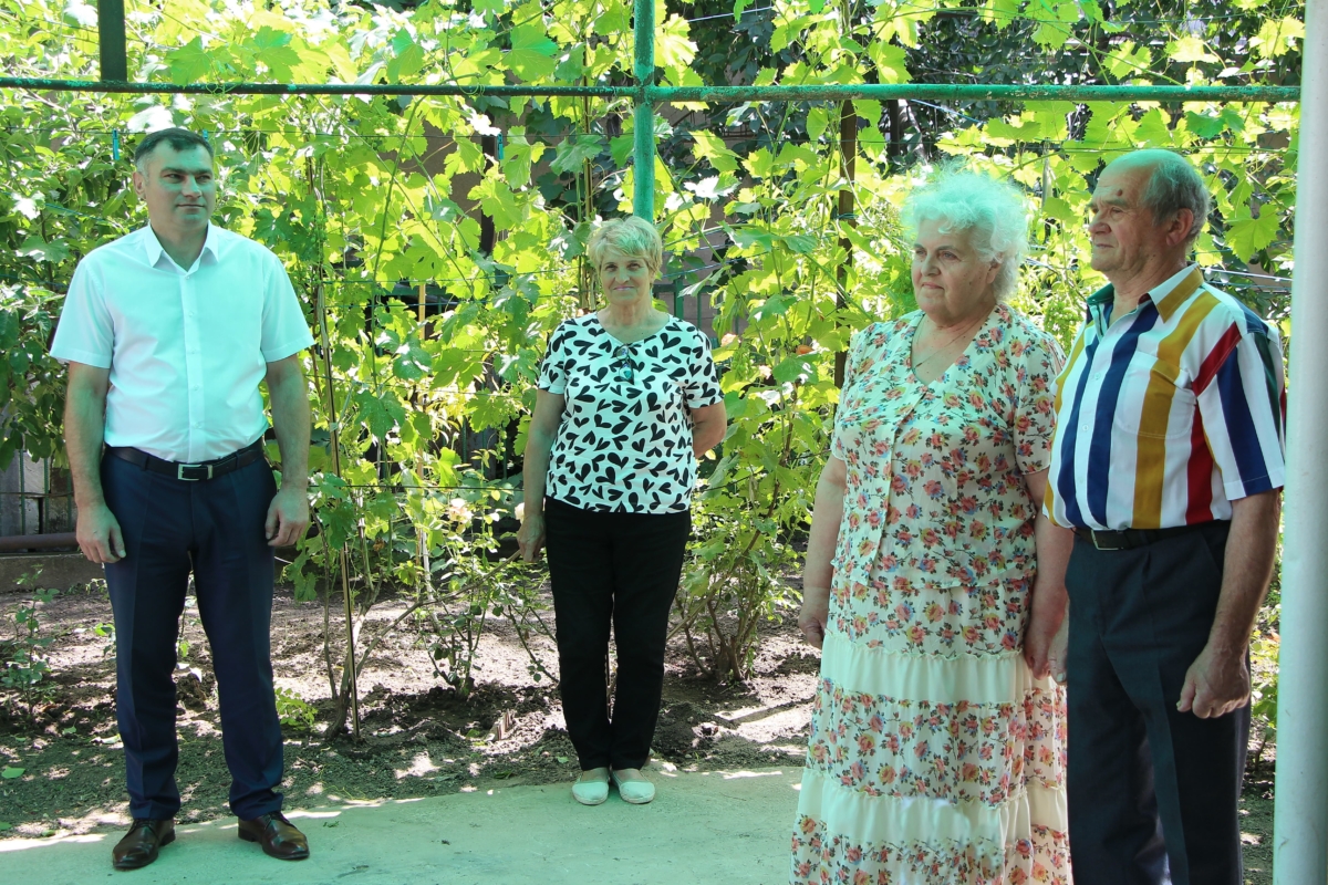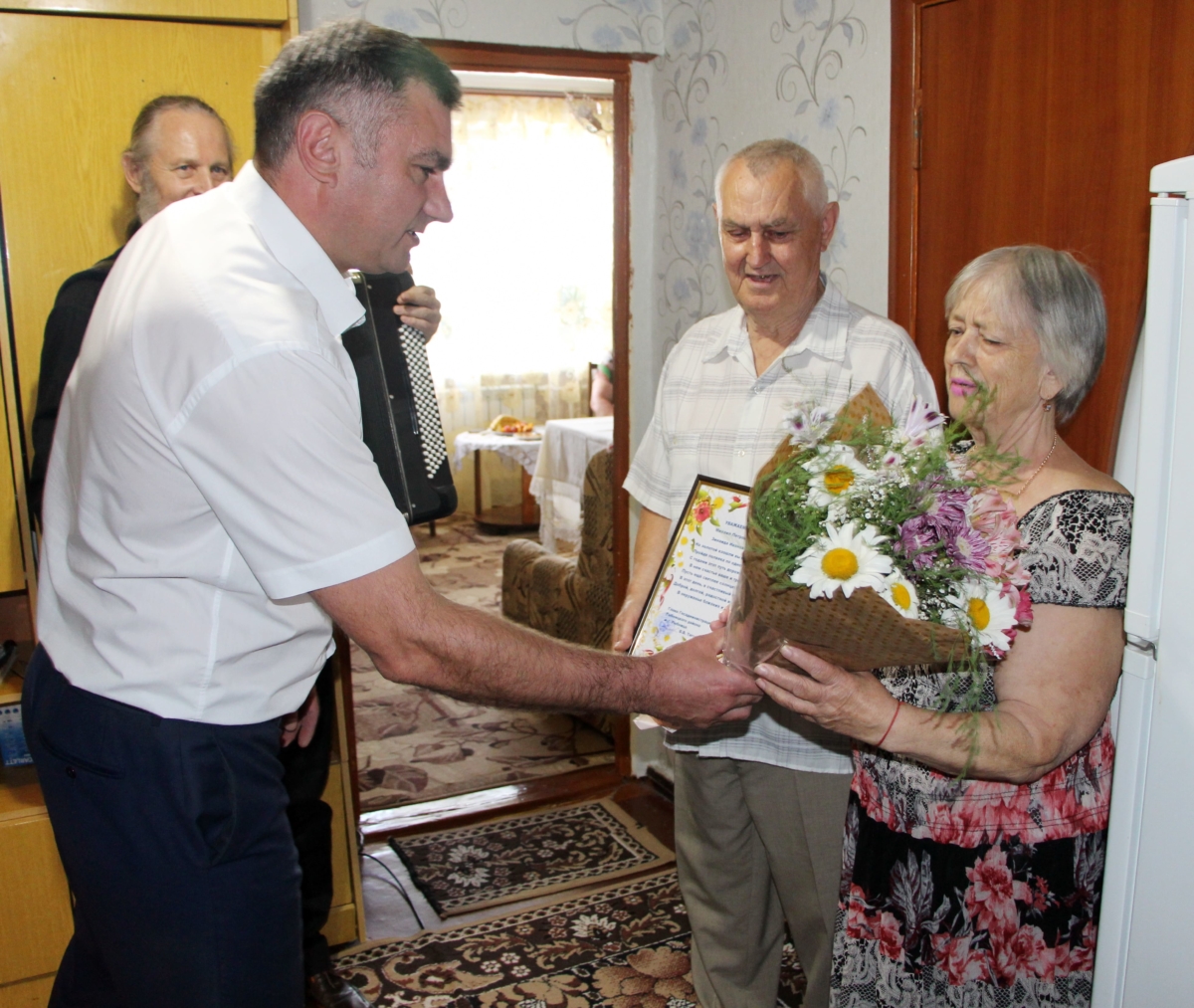 Поздравление принимала семья Мельничук из Новой Михайловки. Виктор и Светлана поженились в июле 1970 года. В этом году у супругов золотая свадьба. Оба находятся на заслуженном отдыхе, ведут домашнее хозяйство. К слову, только плодовых деревьев на территории домовладения семьи 70 штук. Говоря о секретах семейной жизни, подчеркивают – главное не таить обиды и злость друг на друга, жить во взаимопонимании.