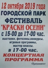 12 октября в городском парке пройдет фестиваль «Краски осени». С 15-00 до 17-00 для юных жителей и гостей города будут организованы выставки, фотозоны, конкурсы, игровые программы и мастер- классы. В 17-00 на летней эстраде парка начнётся концертная программа, а в 17-30 танцевальный вечер для представителей старшего поколения.