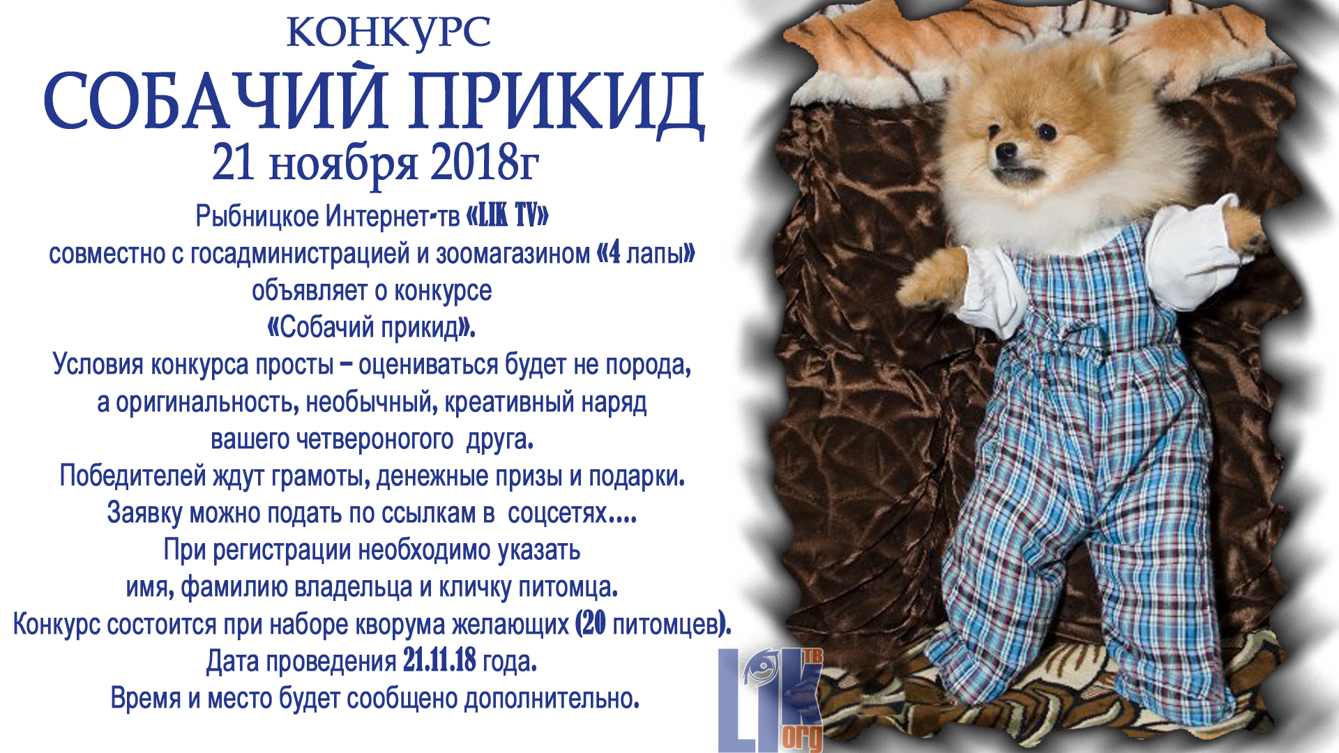 Рыбницкое Интернет-телевидение «LIK TV» совместно с госадминистрацией и зоомагазином «4 лапы» объявляет о конкурсе «Собачий прикид». Условия конкурса просты – оцениваться будет не порода, а оригинальность, необычный, креативный наряд вашего четвероногого друга. Победителей ждут грамоты, денежные призы и подарки. Заявку можно подать по ссылкам в соцсетях: Одноклассники , facebook , vk . При регистрации необходимо указать имя, фамилию владельца и кличку питомца.