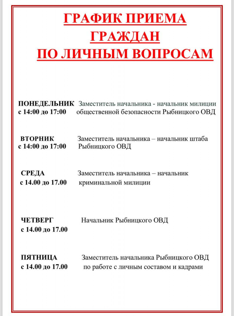 26 ноября с 14:00 до 16:00 в Рыбницком ОВД будет осуществлять прием граждан первый заместитель министра внутренних дел МВД ПМР – начальник милиции общественной безопасности МВД ПМР.